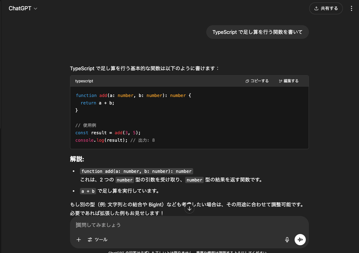 # ã³ã¼ãã£ã³ã°ã¨ã¼ã¸ã§ã³ãã®ç¾ç¶ã®æ´çã¨ã¨ã³ã¸ãã¢ã®ä»äºã®å¤åã«ã¤ã㦠ã³ã¼ãã£ã³ã°ã®ä»äºã«ããã AI æè¡ã®é¢ããã¨ããã°ã[GitHub Copilot](https://github.com/features/copilot) ã代表ããã¨ãã£ã¿è£å®åã主ãããã®ã¨ãã¦èªèããã¦ãã¾ãããè£å®åã® AI ã¯ã¦ã¼ã¶ã¼ãéä¸ã¾ã§æ¸ããã³ã¼ããè£å®ããå½¢ã§ææ¡ãè¡ããã¨ããããã¢ããã°ã©ã ã®ç¸æ¹ã®ãããªåå¨ã¨ãã¦æãããã¦ãã¾ãããä¾ãã° `function add` ã¨æ¸ãå§ããã¨ãAI 㯠`(a: number, b: number): number { return a + b; }` ã¨ãã£ãå½¢ã§é¢æ°ã®å®ç¾©ãææ¡ãã¾ããã¦ã¼ã¶ã¼ã¯ Tab ãã¼ãæ¼ããã¨ã§ææ¡ãåãå ¥ããããææ¡ãæ°ã«å ¥ããªããã°ãã®ã¾ã¾ã³ã¼ããæ¸ãç¶ãããã§ãã¾ãã  è£å®åã® AI ãã¦ã¼ã¶ã¼ã«ããããå©ç¹ã¯ä»¥ä¸ã®ãããªç¹ãæãããã¾ãã - å®åã³ã¼ãèªåçæï¼ãã¹ãã³ã¼ãã®ã¢ãã¯ãã¼ã¿ã®ä½æãã`console.log` ãç¨ããããªã³ããããã°ç¨ã®ã³ã¼ããªã©éå±ã§å復çãªä½æ¥ãä»»ãããããããã«ããéçºã®ã¹ãã¼ããåä¸ããããéçºè ã¯ããéè¦ãªãã¸ãã¯ã«éä¸ã§ããããã«ãªãã - æ°ããè¨èªããã¬ã¼ã ã¯ã¼ã¯ã®å¦ç¿æ¯æ´ï¼æ®æ®µãªããªãè¨èªããã¬ã¼ã ã¯ã¼ã¯ãæ±ãéã«ãAI ããã®è¨èªããã¬ã¼ã ã¯ã¼ã¯ã®æ¸ãæ¹ãææ¡ãã¦ããããããã¯ã¾ãã«ãã¢ããã°ã©ãã³ã°ã«ããç¥è移転ã®å¹æã«è¿ãã ããã«ã以ä¸ã®è¨äºã§ã¯ GitHub Copilot ãéçºè ã®çç£æ§ã«ä¸ããå½±é¿ã«ã¤ãã¦ã®èª¿æ»çµæãç´¹ä»ããã¦ãã¾ãã http://github.blog/news-insights/research/research-quantifying-github-copilots-impact-on-developer-productivity-and-happiness/ ããããè£å®åã® AI ã¯ããã¾ã§ã¦ã¼ã¶ã¼ãæ¸ããã³ã¼ããè£å®ãããã®ã§ãããã¦ã¼ã¶ã¼ãæ¸ãã³ã¼ãã®ç¯å²å ã§ããææ¡ãè¡ããã¨ãã§ãã¾ãããã¤ã¾ããã¦ã¼ã¶ã¼ãæ¸ããªãéã AI ã¯ä½ãææ¡ããªãã®ã§ããã¤ã¾ãã¯éçºè ã®çç£æ§ã幸ç¦åº¦ã¯ç¢ºãã«åä¸ãããã®ã®ãéçºè ãä¸ããããã¿ã¹ã¯ãéè¡ããããã«èªãã³ã¼ããæ¸ãå¿ è¦ãããã¨ããç¹ã§ã¯å¾æ¥ã®éçºã¹ã¿ã¤ã«ã¨å¤§ããå¤ãããã¨ã¯ãªãã£ãã®ã§ããã ChatGPT ã®ç»å ´ã«ãã AI ãåãå·»ãç°å¢ã®å¤åã¯è¨æ¶ã«æ°ããã¨ããã§ããChatGPT ã¯èªç¶è¨èªã§ã®å¯¾è©±ãéãã¦è³ªåã«åçããããæç« ãè¦ç´ã§ãã¾ããã³ã¼ãã£ã³ã°ã®åéã«ããã¦ã対話åã®å½¢å¼ã§ã³ã¼ãã«çæãä¿®æ£ãè¡ã£ãããã³ã¼ãã®å 容ã®èª¬æãæ±ãããã§ããããã«ãªãã¾ããã対話形å¼ã«ããã³ã¼ãã®çæãè¡ã AI ã¢ã·ã¹ã¿ã³ãã¯ããã£ããåãã¨é¡åã§ããã§ãããã  ã³ã¼ãè£å®åã® AI ã¨æ¯è¼ããã¨ã³ã¼ãã 1 æåãæ¸ããã¨ã AI ãã¦ã¼ã¶ã¼ã®æå³ãçè§£ããå¿ è¦ãªã³ã¼ããçæãã¦ãããç¹ã大ããªéãã§ããã¦ã¼ã¶ã¼ã¯èªç¶è¨èªã®ã¿ã§ AI ã«æç¤ºãåºãã¦ããåããè¡ããã¨ãã§ãã¾ããã³ã¼ãè£å®ã®ä¾ã§ã¯ãããã `function add` ã¨æ¸ãå§ããå¿ è¦ããããåæç¥èã¨ã㦠TypeScript ã«ããã颿°ã®å®ç¾©æ¹æ³ãç¥ã£ã¦ããå¿ è¦ãããã¾ããã䏿¹ã§ãã£ããåã® AI ã§ã¯ã2 ã¤ã®æ°å¤ãè¶³ã颿°ã TypeScript ã§æ¸ãã¦ãã ãããã¨ãã£ãèªç¶è¨èªã§ã®æç¤ºãä¸ããã ãã§ç®çãéæããã³ã¼ããçæãã¦ããã¾ãããã®ãã¨ã¯ã³ã¼ãã£ã³ã°ã®ç¥èæããªãéã¨ã³ã¸ãã¢ã®äººã ã«ã¨ã£ã¦ã AI ãå©ç¨ãã¦ã³ã¼ããæ¸ããã¨ãã§ããå¯è½æ§ã示åãã¦ãã¾ãã ãã®ãããªãã£ããåã® AI ã¯éçºè ã®çç£æ§ãåä¸ãããã ãã§ãªããéçºè ãã³ã¼ããæ¸ããã¨ã«å¯¾ãããã¼ãã«ãä¸ããå¯è½æ§ãããã¾ããç¹ã«ããã°ã©ãã³ã°åå¿è ãéã¨ã³ã¸ãã¢ã®äººã ã AI ãæ´»ç¨ãã¦èªåã®ã¢ã¤ãã¢ãå®ç¾ããæå©ãã¨ãªãã§ãããããããã䏿çãªæç¤ºãä¸ããå ´åãAI ãæå³ããéãã®ã³ã¼ããçæã§ããªãã£ãããå質ã®ä½ãã³ã¼ããçæãã¦ãã¾ããã¨ããã°ãã°ããã¾ãããã£ããåã® AI ã¢ã·ã¹ã¿ã³ãã§ã¯èªç¶è¨èªã§ã³ã³ããã¹ããæ£ããä¼ããã¨ãã£ãããã³ããã¨ã³ã¸ãã¢ãªã³ã°ã®ã¹ãã«ãæ±ããããããã«ãªãã¾ãããAI ã«å¯¾ãã¦é©åãªæç¤ºãä¸ããããã«ã¯ãAI ã®ç¹æ§ãçè§£ããã©ã®ãããªæ å ±ãæä¾ããã°æã¾ããçµæãå¾ãããããå¦ã¶å¿ è¦ãããã¾ããçµå±ã®ã¨ãããAI ã«é©åãªæç¤ºãåºããããAI ãçæããã³ã¼ããã¬ãã¥ã¼ããããã«ã¯ã½ããã¦ã§ã¢ã¨ã³ã¸ãã¢ãªã³ã°ã®ç¥èãæ±ãããã¦ãããéçºè ã®ä»äºã¯ä¾ç¶ã¨ãã¦éè¦ãªå½¹å²ãæããã¦ãã¾ããã 䏿¹ãã£ããåã®å½¢å¼ã¨ããå¶ç´ããããã¨ãããéçºè ã®ä»äºã大ããå¤åããããããªãã¬ã¤ã¯ã¹ã«ã¼ã¾ã§ã«ã¯è³ã£ã¦ãã¾ããã§ããããã£ããåã® AI ã§ã¯ãã¦ã¼ã¶ã¼ãâãAIãâãã¦ã¼ã¶ã¼ãã¨ããåæ¹åã®ããåããå¿ è¦ã§ãããAI ãã³ã¼ããçæãããã³ã«ã¦ã¼ã¶ã¼ã«ãããã£ã¼ãããã¯ãä¸ããå¿ è¦ãããã¾ããã¿ã¹ã¯ã®ç®çãéæããããã«ã¯éå¸¸è¤æ°åã®ä¼è©±ã®å¾å¾©ãå¿ è¦ã§ãããããAI ã«ã³ã¼ããçæããã¦ããéã«éçºè ã¯ä»ã®ã¿ã¹ã¯ã«åãçµãã¨ãã£ã並è¡å¦çãé£ãããéçºè ã®çç£æ§ã大ããåä¸ããããã¨ã¯ã§ãã¾ããã§ãããã¾ããæ¢åã®ã³ã¼ããã¼ã¹