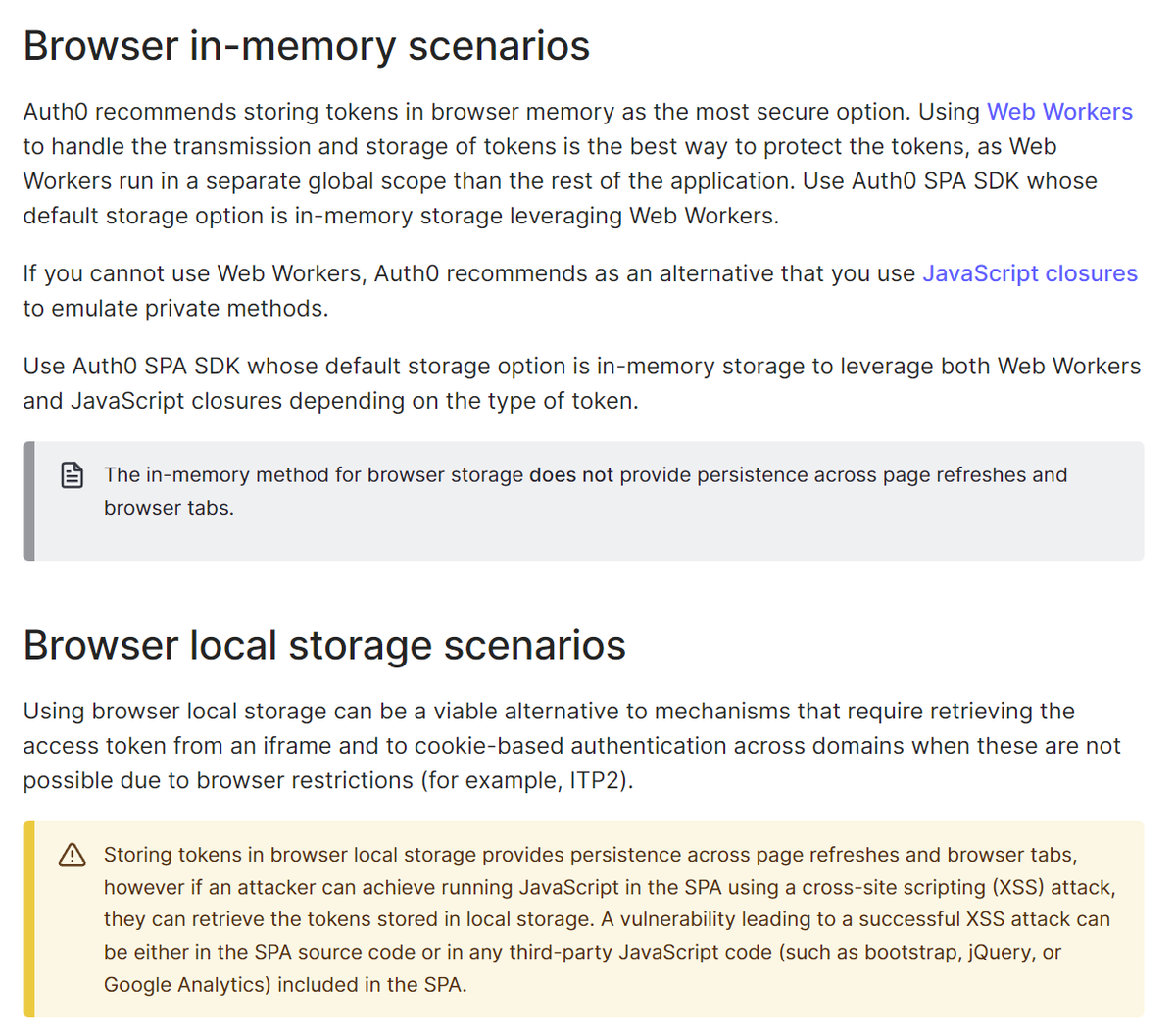 補足すると、Auth0は明示的にドキュメント内でin-memory方式についての記述中でXSSについて言及はしていません。しかし、localStorageについての記述中でXSSに対して脆弱である、という記述があるため、in-memory方式は逆にXSSの対策として有効である、という主張だと判断しました。