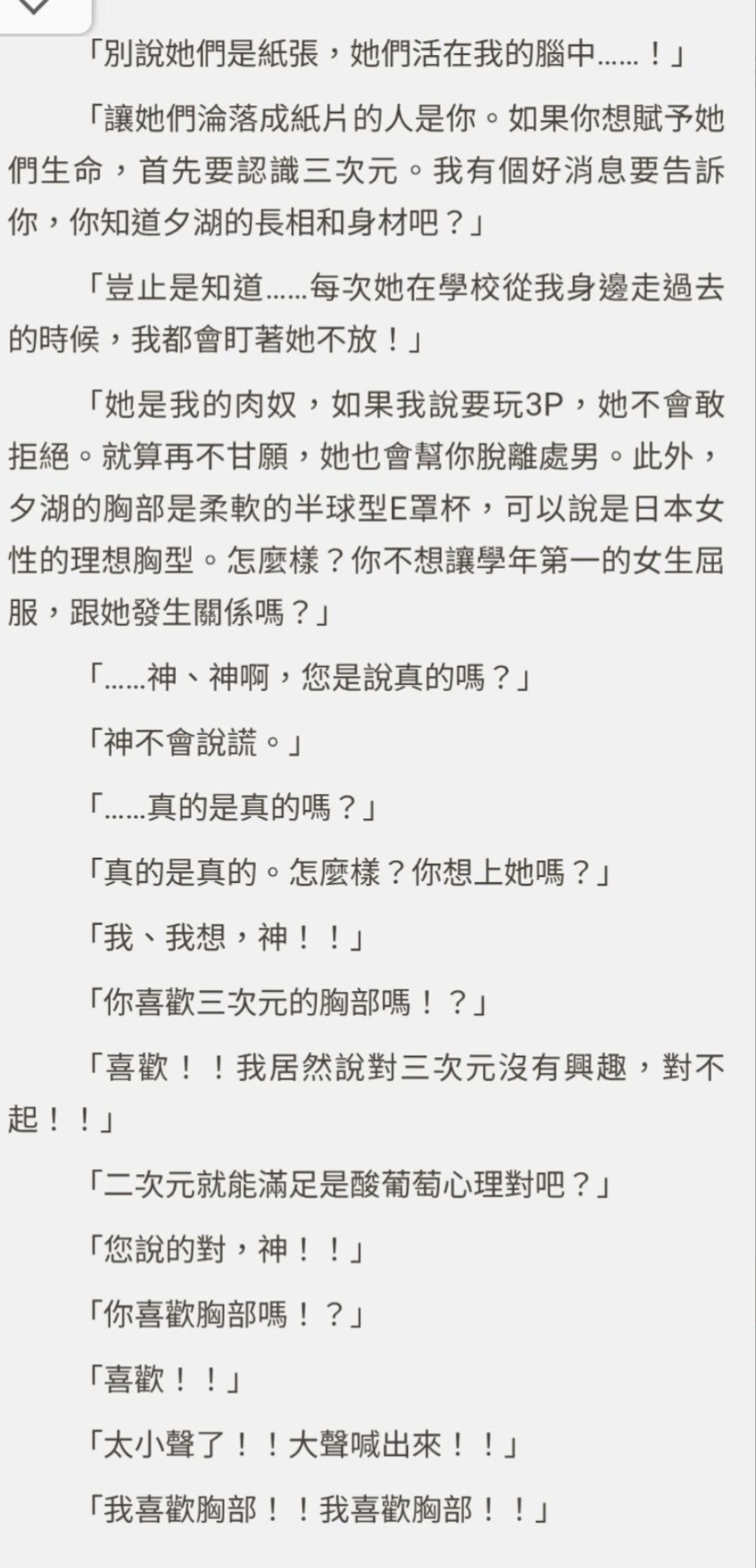 遗失之泪 说: 怎么说呢,其实也可以找补的;不过我首先要叠个甲,我没看过原作,也没对这部作品报什么幻想(feel是个让人担忧的重要因素)。首先,因为这段对话得结构大致是这样,即A“夕湖是男主的肉奴”,B“男主若要求夕...