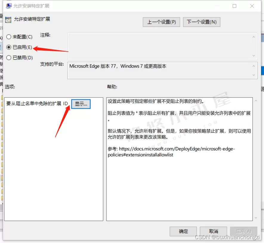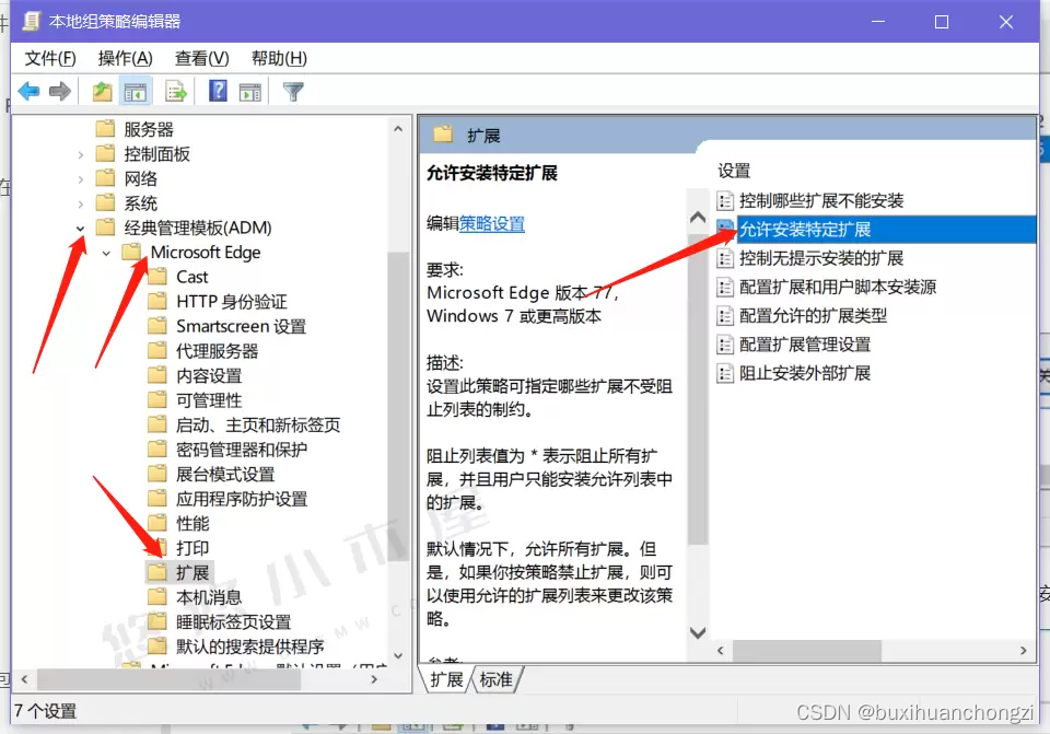 打开【Microsoft Edge→扩展 →允许安装特定扩展】