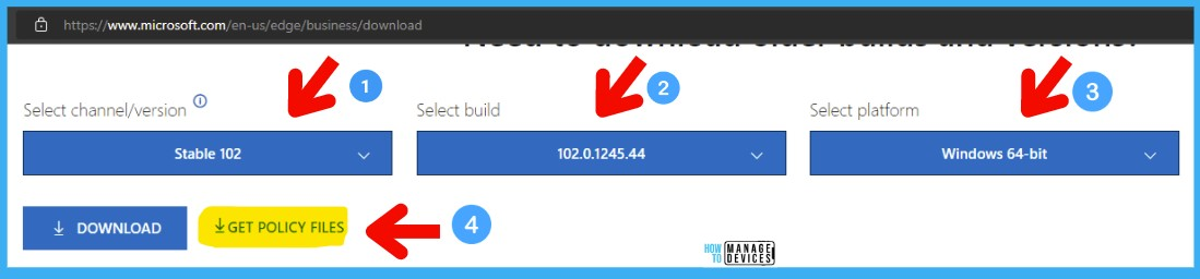 在 Microsoft Edge 商业下载页面上,选择频道/版本、构建版本和平台,然后点击“GET POLICY FILES”获取策略文件。