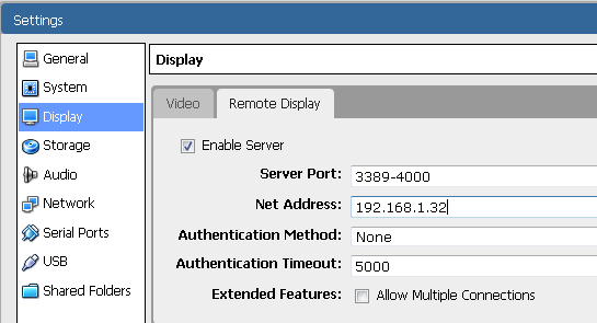 | Net Address | VBoxManage modifyvm --vrdeaddress |