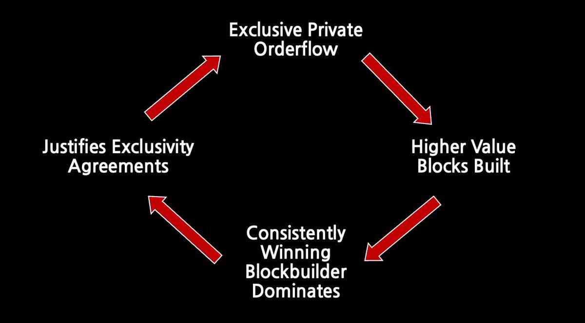 このように単一のビルダーがメタマスクから送信されるイーサリアムのOFの大部分に独占的にアクセスできるようになると競争に勝ちやすくなり、ブロックの大部分を構築することができるようになります。そして、こういった価値の高いPOFにアクセスできないブロックビルダーは、徐々に廃れていきます。