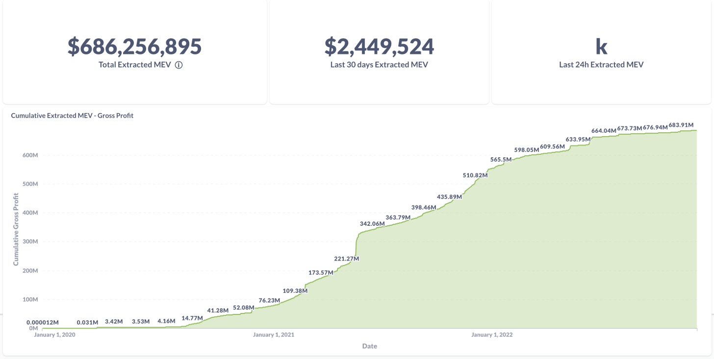 データを見ると、2020年1月1日以降、累積抽出されたMEVは6.8億ドルであり、直近30日間に200万ドルが抽出されていることがわかります。