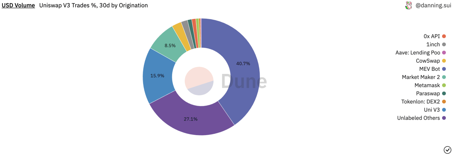 2022年9月、Uniswapの取引量の40%以上はMEVボットによる貢献で、Uniswapのフロントエンドからの取引は20%未満です。
