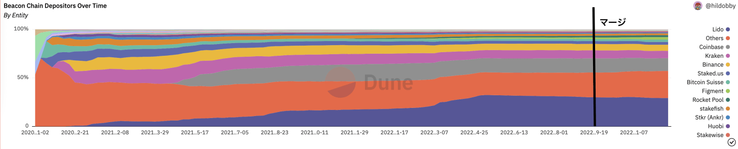 ちなみにもしMEV-boostが集中化の原因かどうかを判断する場合、どの指標を見ればいいのでしょうか?。個人のバリデーターがMEVにアクセスできるようになったのはマージ後なので、マージ前とマージ後のステーカーのシェア率の変化を見れば良さそうです。もしシェア率が高まれば、集中化の促進と相関があるといえるでしょう。