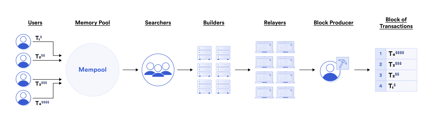 MEV-Boostでは、バリデーターが接続したリレーの中から最も入札額の高い(最も収益性の高い)ブロックを選択。このサプライチェーンの主なアクターには、サーチャー、ビルダー、そしてリレーがあります。