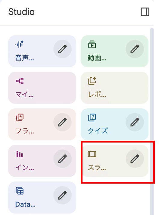 studioタブから、スライドを生成します。