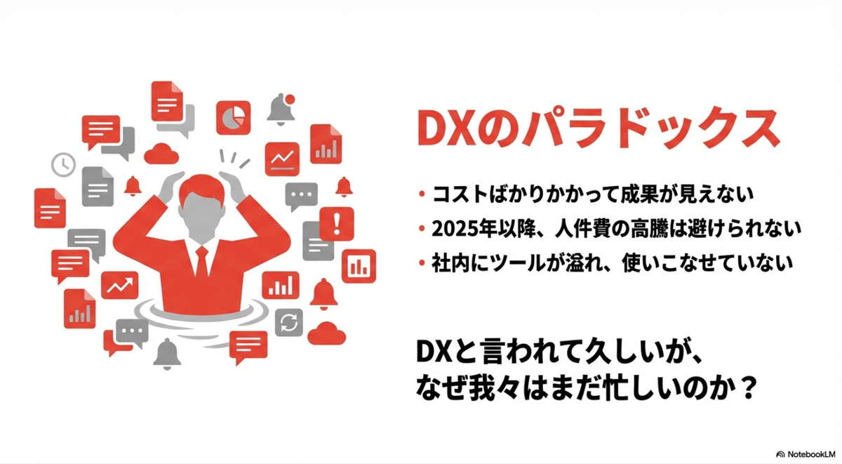 「仕事が楽になった」という声がある一方で、「まだ使いこなせていないツールも多い」という声もよく聞きます。結局のところ、なんだかんだでPowerPointやスプレッドシートに戻り、細かな調整に時間を取られてしまうことも少なくありません。これはNotebookLMの機能不足ではなく、人間が使う前の準備が整っていないことが原因です。