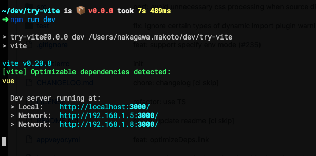 実際にnpm run dev実行から上記のログが表示されるまでは1秒かかっておらず、フロントエンドの開発サーバ起動時間としてはまさに爆速と言えそうです。