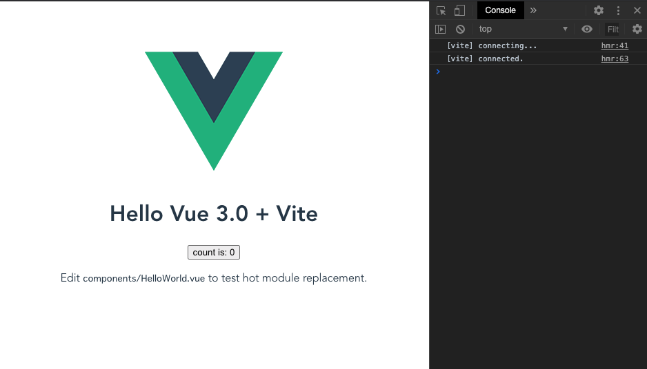 コンソールにはvite上のイベントが出力されており、HMR対象のファイル、例えば HelloWorld.vue を変更し保存すると、コンソールに[vite] /src/components/HelloWorld.vue reloaded.といった変更を検知したファイル名とともに表示がされます。