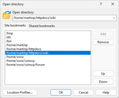 In Commander interface the Location Profiles dialog is additionally available. The Bookmark dialog manages either bookmarks that contain local directories or remote directories, depending on the context where the Bookmark dialog was opened. The Location Profiles dialog manages bookmarks that can contain a local and a remote directory at the same time.