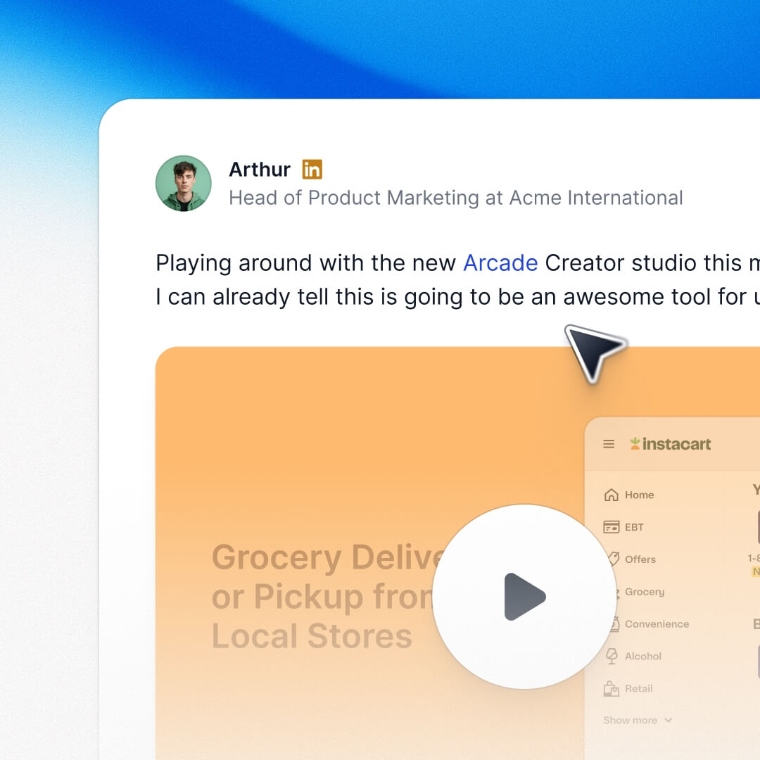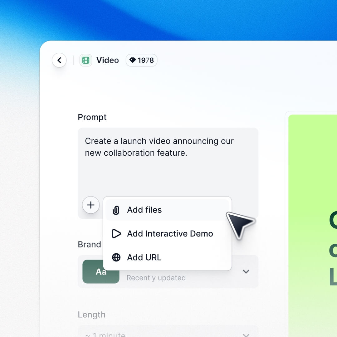 Bring a typed prompt, an existing Arcade demo, or a Figma file. Create a polished, on-brand video without any back-and-forth with creative.