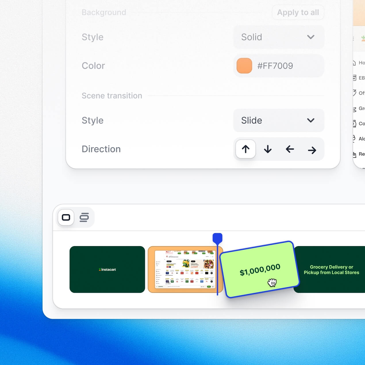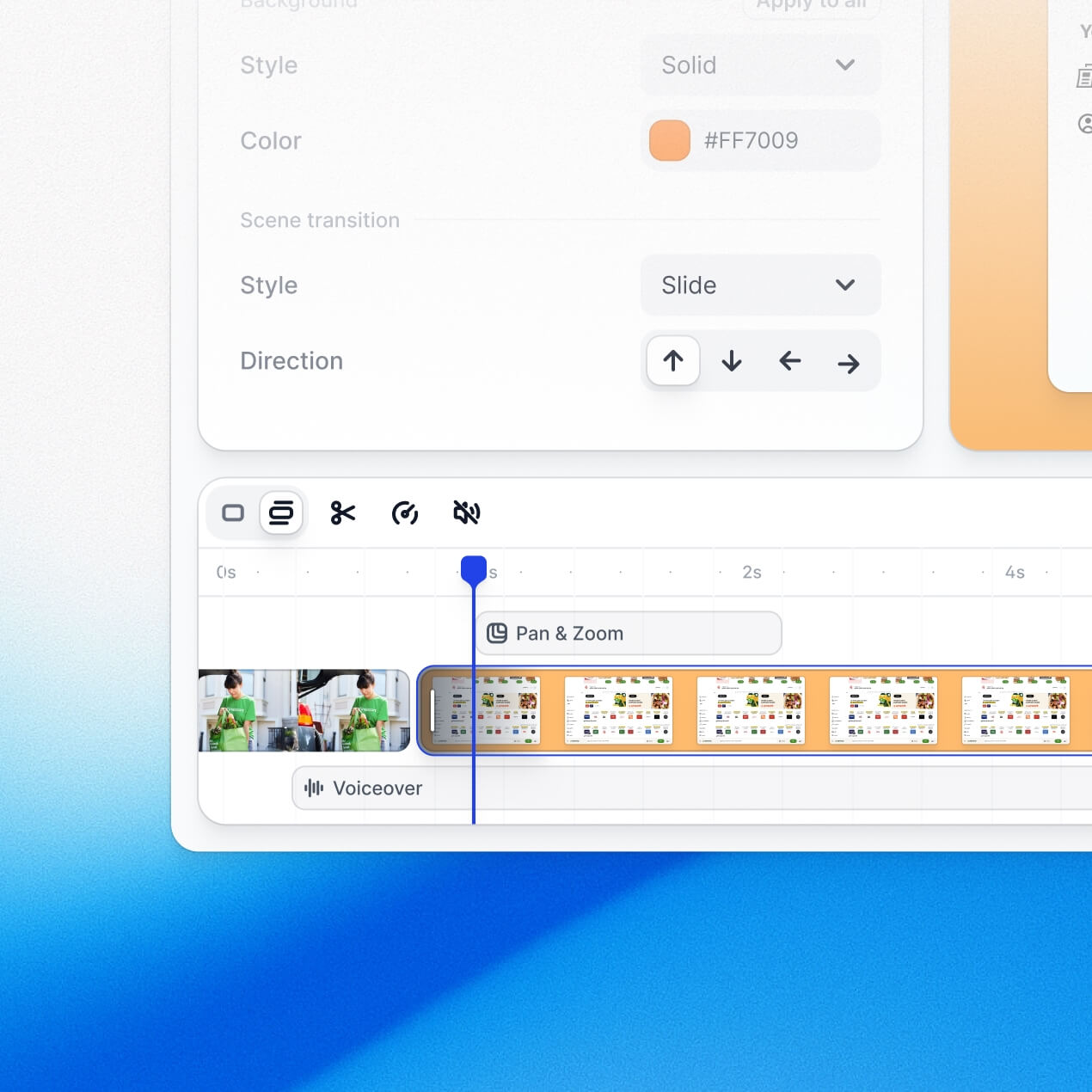 Trim, reorder, and adjust from a simple visual timeline. Swap a headline, shorten a clip, or update the voiceover. No video editing background required.