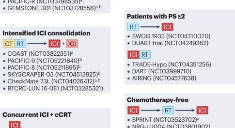 Patients with unresectable stage III non-small-cell lung cancer without EGFR or ALK mutations typically receive the PACIFIC regimen â concurrent chemoradiotherapy (cCRT) followed by consolidation with durvalumab â whereas those with EGFR-mutant disease typically receive cCRT followed by an EGFR inhibitor. Nonetheless, a subset of patients within this heterogeneous group might be able to completely avoid consolidation therapy, whereas others are unable to tolerate cCRT. In this Review, the authors describe the standard-of-care approach in this setting, followed by discussions of treatment optimization for specific subgroups, as well as important future research questions.