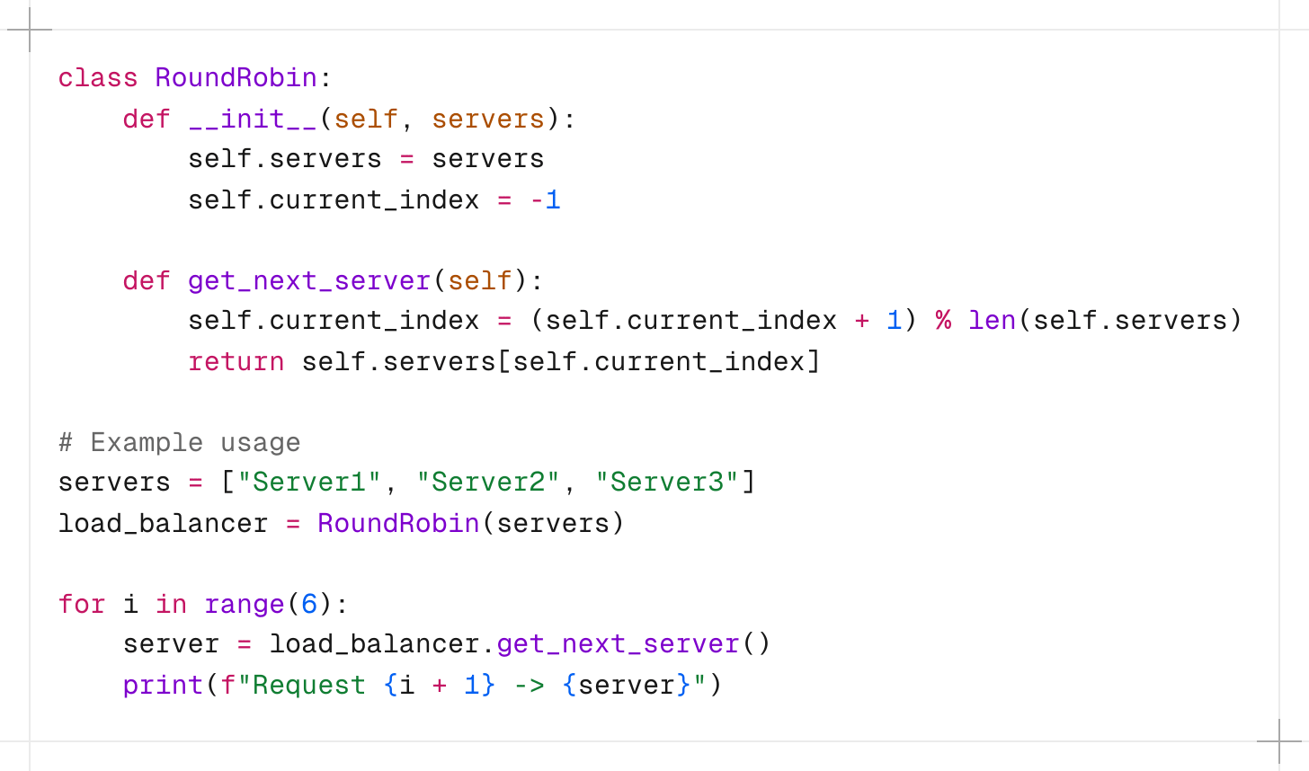 In this implementation, the RoundRobin class maintains a list of servers and keeps track of the current index.