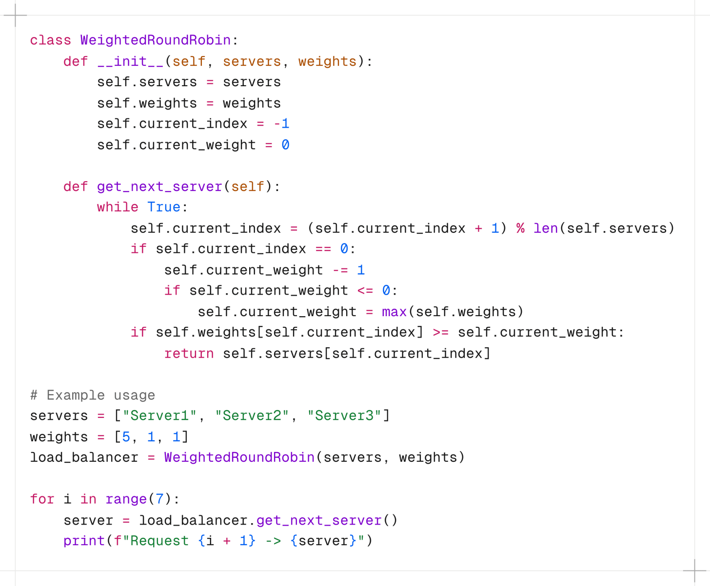 In this implementation, the WeightedRoundRobin class takes a list of servers and their corresponding weights.