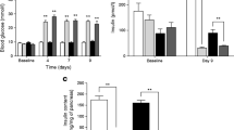 OGTTs were performed on days 21 and 35. Glucose (2 mg/g body weight) was delivered by oral gavage after a 16–18 h fast and blood glucose levels were measured at 0, 20, 40, 60, 90, 120, 150 and 180 min. A blood sample was taken from v. facialis at time 0 min.