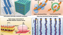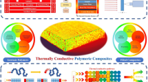 The heat transport mechanism in composites is more complex than that in pure polymers, and the k of composites depends on multiple factors including thermally conductive filler characteristics (size, shape, crystal structure) [43,44,45,46,47], polymer matrix characteristics (crystallization degree, molecule weight, interchain interaction and chain orientation) [3, 24, 36, 48], microstructure control of fillers (filler orientation and network structure) [49,50,51] and ITR (filler/filler, polymer/polymer, and filler/polymer) [52]. The parameters such as loading and intrinsic k of thermally conductive filler play a decisive role in the resultant k of composites. When filler loading is low, thermally conductive fillers are challenging to construct effective thermally conductive pathways to transfer the phonon. Thus, high loading and high intrinsic k of fillers are needed to improve the k of composites significantly. When the filler is identified, microstructure control of filler has become a more crucial factor in constructing effective thermal transport pathways, reducing interfacial thermal resistance between filler/polymer and obtaining higher k [53]. For example, the perfect alignment of RGO platelets undoubtedly endows the RGO films with extraordinary in-plane k owing to the intrinsically high intrinsic k of graphene along the basal planes and the limited filler/polymer interfaces [54]. The detailed explanations of the relationship between the k of composites and multiple factors have been systematically summarized by some reported reviews [53, 55,56,57].