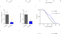 a, Summary of fly lifespan experiments, including the representative trials presented in the figures, but excluding those with rapamycin (see Extended Data Fig. 8a). Experiments were performed on females unless otherwise noted. The total number of animals in the trialâ=âdead + censored. log-rank test P value is reported. b, c, Feeding with RU486 does not have an effect on the lifespans of: UAS-dC160RNAi-only controls (b; log-rank test, Pâ=â0.28; control, nâ=â142; RU486, nâ=â146); or TIGS-only controls (c, log-rank test, Pâ=â0.41, control, nâ=â141 RU486, nâ=â145). d, Inducing dC53RNAi in the gut by feeding RU486 to female TIGSâ>âdC53RNAi flies extends their lifespan (log-rank test, Pâ=â3âÃâ10â6; control, nâ=â143; RU486-treated, nâ=â139). e, Inducing dC160RNAi predominantly in the fat body by feeding RU486 to S1106â>âdC160RNAi flies has no effect on their lifespan (log-rank test, Pâ=â0.21; negative control, nâ=â158; RU486, nâ=â155). f, Inducing dC160RNAi in neurons by feeding RU486 to elavGSâ>âdC160RNAi females by RU486 has a modest effect on their lifespan (Pâ=â0.03, log-rank test; negative control, nâ=â148; RU486, nâ=â155). g, RU486 feeding does not have an effect on the lifespan of the GS5961-only controls (log-rank test, Pâ=â0.88; negative controls, nâ=â89; RU486, nâ=â91). Experiments in bâg were performed as single trials.