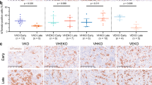 Staining for HIF-1α and HIF-2α was scored positive if expression was observed in any epithelial cell nuclei. Cores were scored positive for CA9 if membranous expression was observed in >10% of epithelial cells. Staining for VEGF, PHD1, PHD2 or PHD3 was scored positive if cytoplasmic expression was observed in >10% of epithelial cells. Cores were scored positive for Dll4 if expression was observed in any endothelial cells. In addition, Dll4 was scored in the neoplastic cells within TMA cores in which it was observed at high levels, that is, levels that approximated the intensity of Dll4 expression by endothelial cells. The highest intensity score among replicate cores was used as the score for each patient. Assays and scoring were performed blind to clinical and pathological data (withheld for analysis until all data were complete).