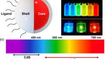 Confined inside a QD, an electron and a hole can recombine, emitting a photon with energy equal to the gap between the highest occupied and the lowest unoccupied states. Figure 1a shows a photograph of colloidal solutions of CdSe QDs illuminated with a 365 nm ultraviolet lamp. Despite the wide range of emission wavelengths, all flasks contain nominally the same chemical species. The difference is they are crystallites of different sizes, ranging from about 1.7 nm in the blue-emitting solution to about 5 nm for the red-emitting solution. Proper control of surface chemistry can essentially eliminate the midgap states associated with surface dangling bonds. As a result of the reduced probability of carrier trapping and non-radiative recombination, high (>80%) luminescence quantum efficiencies (the ratios of the number of photons emitted to the number of photons absorbed) have been reported for several QD materials.5–9 Many chemical developments were necessary to obtain QDs that combined high luminescence efficiency with narrow emission spectra and whose luminescent properties remained stable over a long period of time.