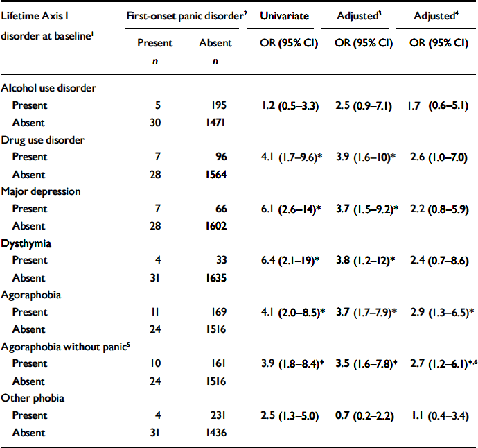 Lifetime Axis I disorder at baseline1 | First-onset panic disorder2 | Univariate | Adjusted3 | Adjusted4 | |