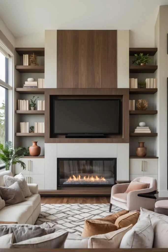 A built-in fireplace TV wall is the epitome of functional elegance. This design integrates custom shelving units on either side of the fireplace, offering abundant storage and display space without sacrificing style. These shelves provide the perfect opportunity to showcase books, plants, art pieces, and personal memorabilia, making your living room uniquely yours.