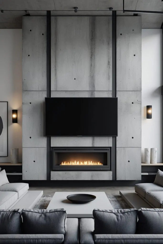 Concrete finishes have become increasingly popular for those seeking a sleek, industrial-modern look. A concrete fireplace TV wall brings a raw, edgy vibe that contrasts with the warmth of the flames and the comfort of your living space. This design is perfect for minimalist homes or loft-style apartments.