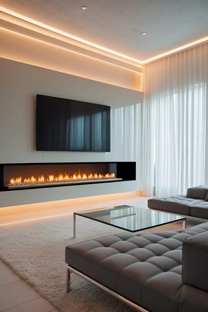 Linear fireplaces are sleek, low-profile, and perfect for modern interiors. A linear fireplace TV wall emphasizes horizontal lines, often incorporating LED lighting underneath the fireplace to create drama and ambiance. This setup draws the eye along the wall, elongating the space and adding a sophisticated touch.