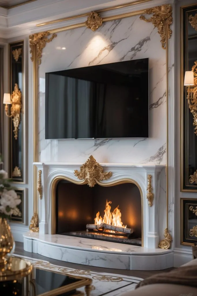 To balance the coolness of marble, soften the surrounding decor with plush textiles, warm lighting, and wood accents. This contrast helps the space feel inviting rather than cold. Marble also pairs beautifully with metallic fixtures in gold, brass, or chrome, enhancing the luxurious feel of your fireplace TV wall.