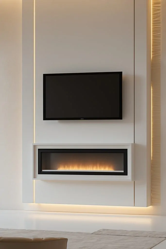 The minimal white fireplace TV wall is a timeless choice for homeowners who love clean, airy aesthetics. This design focuses on simplicity, creating a bright and calming environment that visually expands your space.