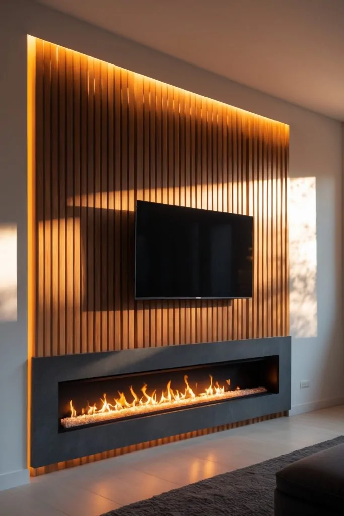 Choosing wood with a natural finish highlights the grain patterns and subtle variations in tone, making the wall feel alive and organic. This warmth contrasts beautifully with the sleek, black surface of a TV and the soft flicker of a fireplace, creating a cozy yet refined atmosphere. The tactile nature of wood adds depth that makes the room feel more intimate and welcoming.