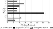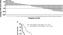 Enrolled in the study were 40 patients and 184 courses of VX-710 plus M/P were administered. Intensive pharmacokinetics, which were performed on six patients who received one cycle of M/P alone, followed by VX-710 plus M/P for all other cycles, showed that VX-710 did not alter mitoxantrone clearance. VX-710 blood concentration at the time of mitoxantrone administration averaged 4.52 μg/ml. VX-710 plus M/P was well tolerated. Transient nausea/vomiting and mild neutropenia were the principal treatment toxicities. Five patients experienced an uncomplicated febrile neutropenic episode (12%), three had severe nausea/vomiting, and two experienced transient moderate to severe ataxia. Of the 40 patients, 12 (30%, 95% confidence interval 16–44%) had a reduction in PSA of ≥50% and 9 of the 12 patients (23% overall, 95% CI 10–35%) achieved a reduction in PSA of ≥80% that was sustained for the duration of treatment with M/P plus VX-710. The median time to PSA progression was 41 weeks (95% CI 34–68 weeks). Of the 40 patients, 15 completed treatment with stable disease and 13 had progressive disease with increasing serum PSA during study treatment. Median survival was 48 weeks for the intent-to-treat population of 40 patients.