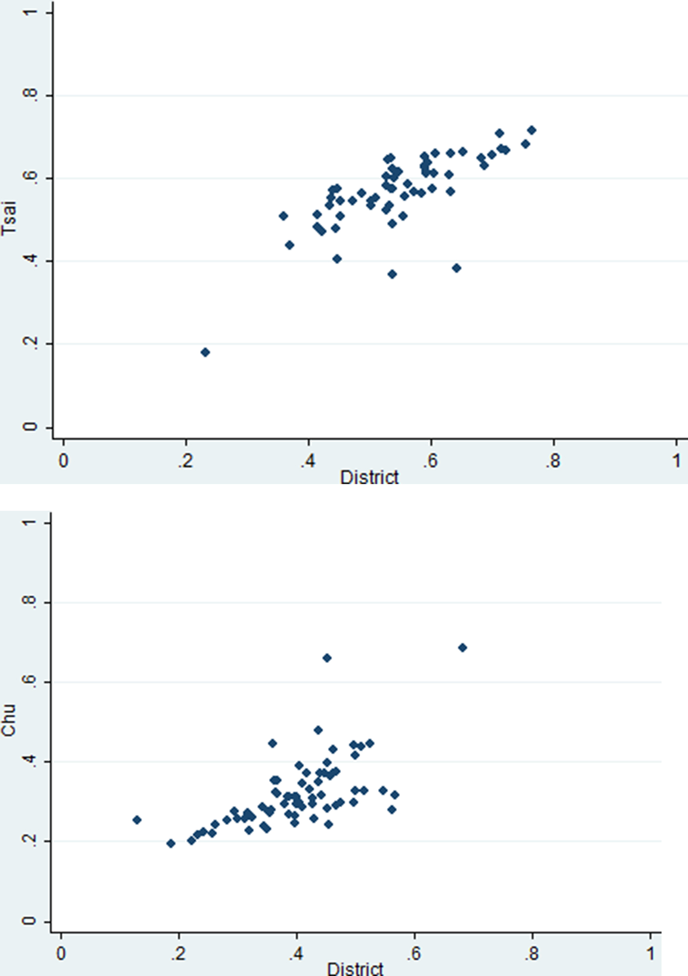 On January 16, Tsai Ing-wen captured a clear majority of the presidential vote (56.1%), while the DPP captured an outright majority of seats in 2016 (60.2%), their first legislative majority. In district races, the DPP managed an average vote share increase from 2012 of 7.48%, while the KMT averaged an 8.09% loss. In addition, the newly formed NPP, in which the DPP coordinated in several districts, captured three district and two party list seats.Footnote 3 The success of both Tsai and her party suggests a turning point in Taiwanese politics; however, it remains unclear whether anti-KMT sentiment benefited both Tsai and her party more broadly or the popularity of Tsai in effect pulled the party up to a legislative majority.