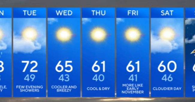 Thursday stays a bit breezy with winds up to 25 mph and very dry air, especially in western Maryland. That could raise some minor fire weather concerns, depending on how much rain (if any) falls with Tuesday's front. Friday looks calmer and brighter as high pressure takes over again — another crisp, dry autumn day.
