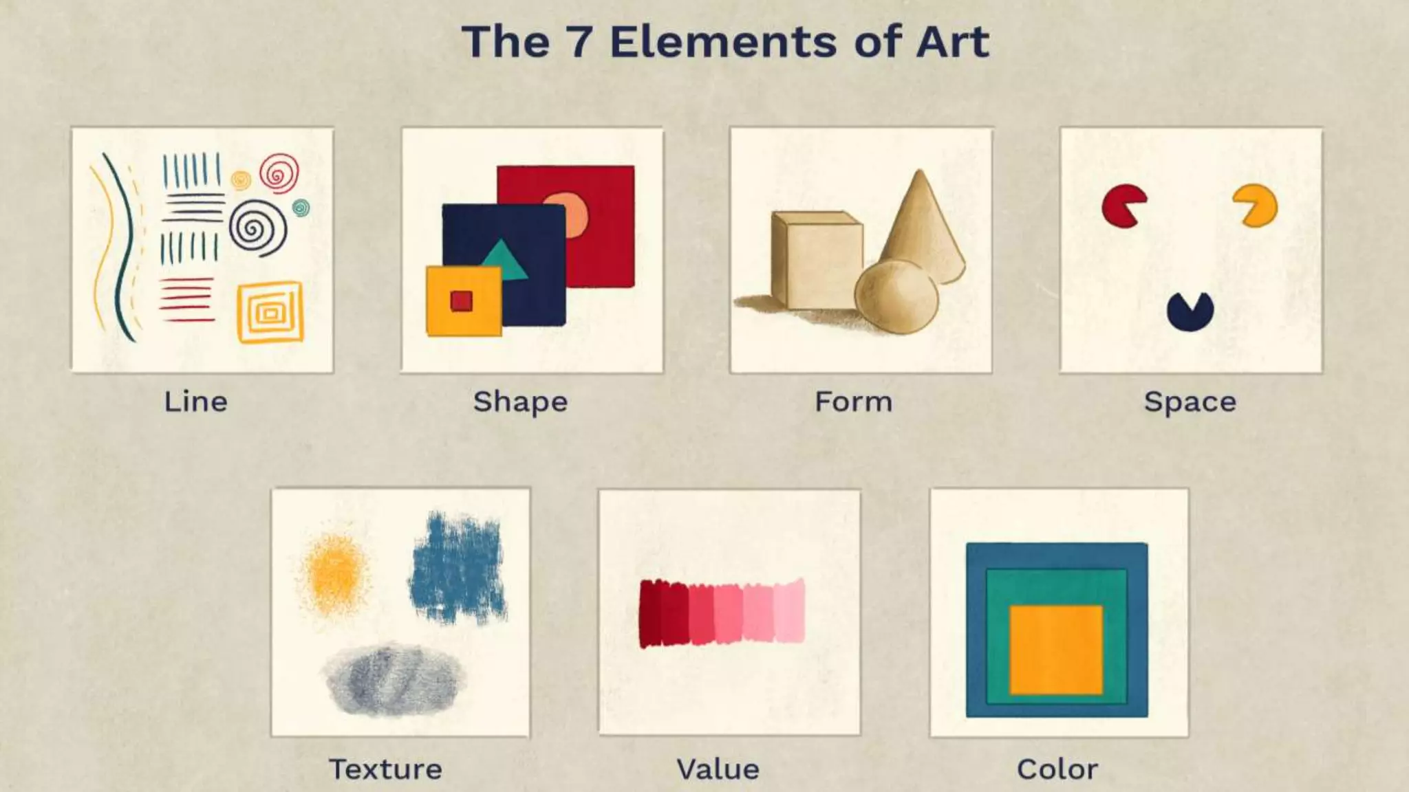 Artists manipulate elements like line, shape, form, space, color, value, and texture to convey meaning and mood in their work. Understanding elements such as how smaller objects appear farther away while larger objects seem closer through the use of space allows viewers to describe, analyze, and discuss works of art using a shared visual language.