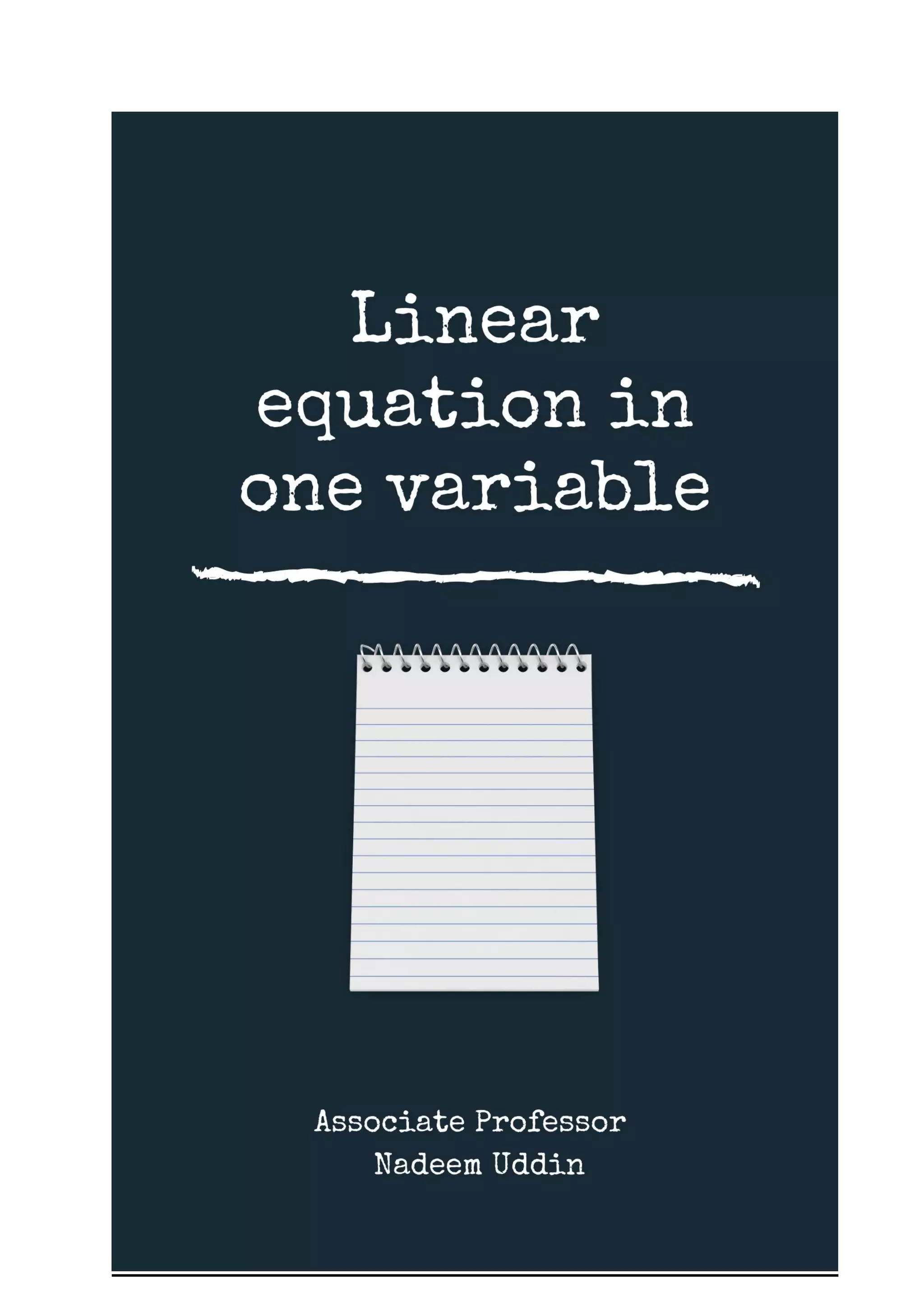 Linear equations in one variable can be written in the form ax + b = 0, where a and b are real numbers and a ≠ 0. These equations have exactly one solution, also called the root of the equation. Several examples are provided of solving linear equations in one variable by isolating the variable term. The solutions are obtained by performing the inverse operations of the coefficients on both sides of the equations.