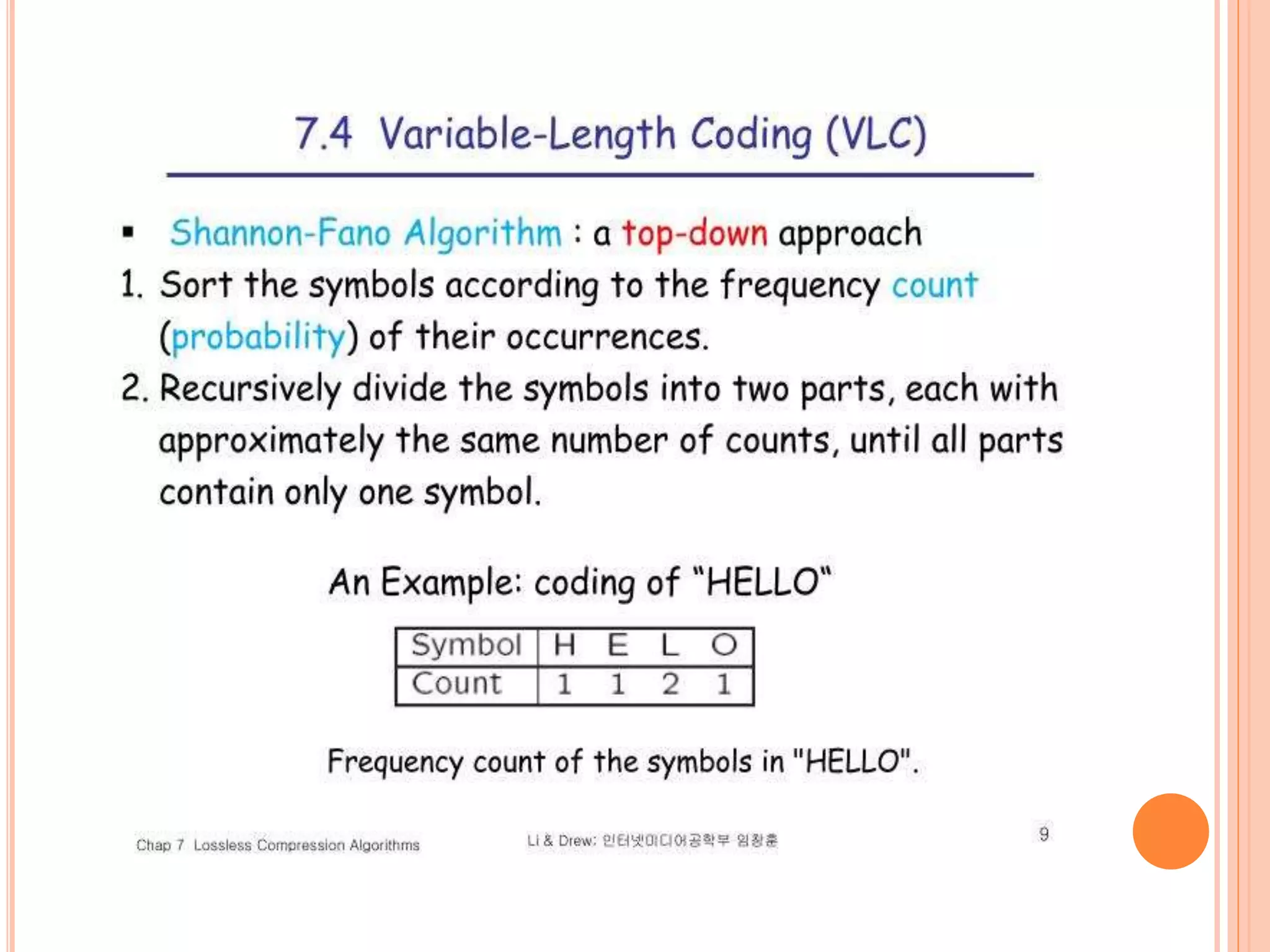 This document discusses various lossless compression algorithms including run-length coding, Shannon-Fano algorithm, Huffman coding, extended Huffman coding, dictionary-based coding like LZW, and arithmetic coding. It provides details on the basic principles of run-length coding, an example of extended Huffman coding for a source with symbols A, B, and C, and outlines the structure of the document.