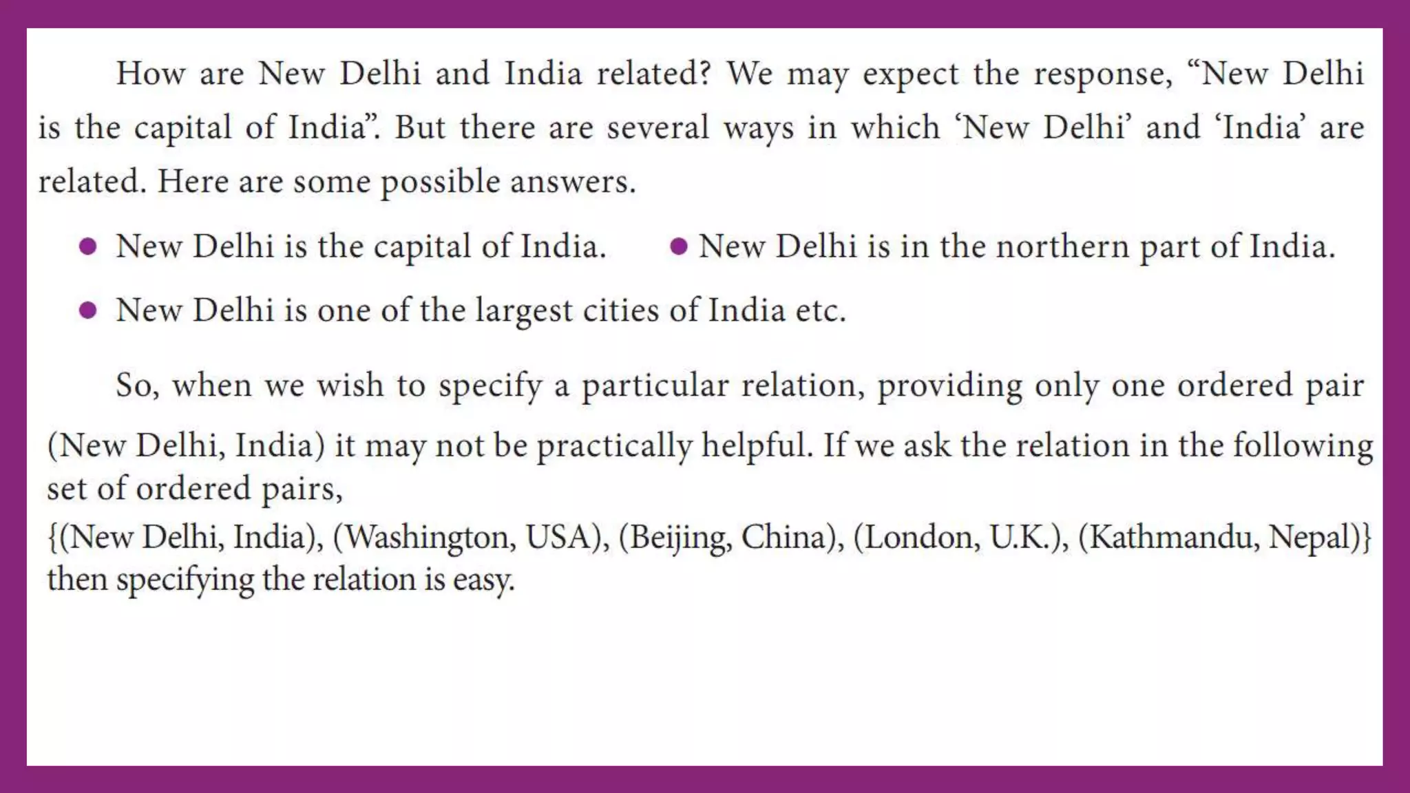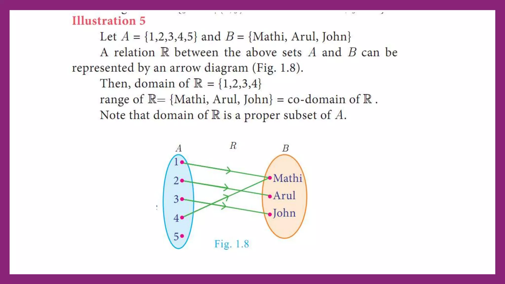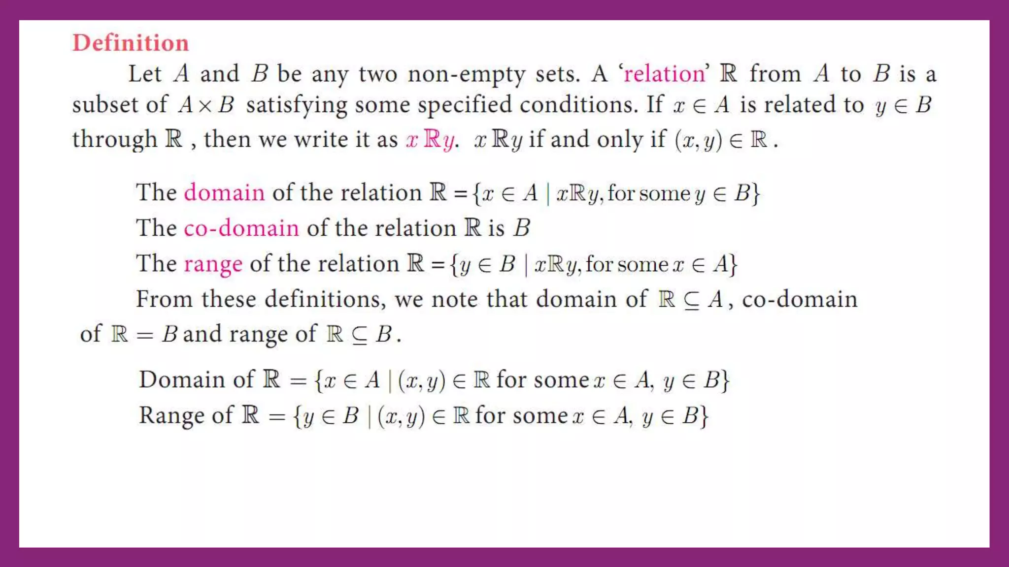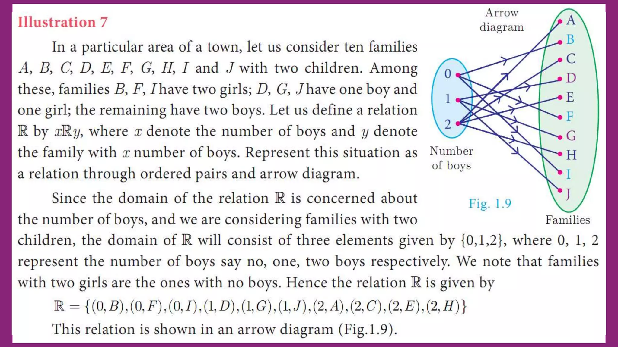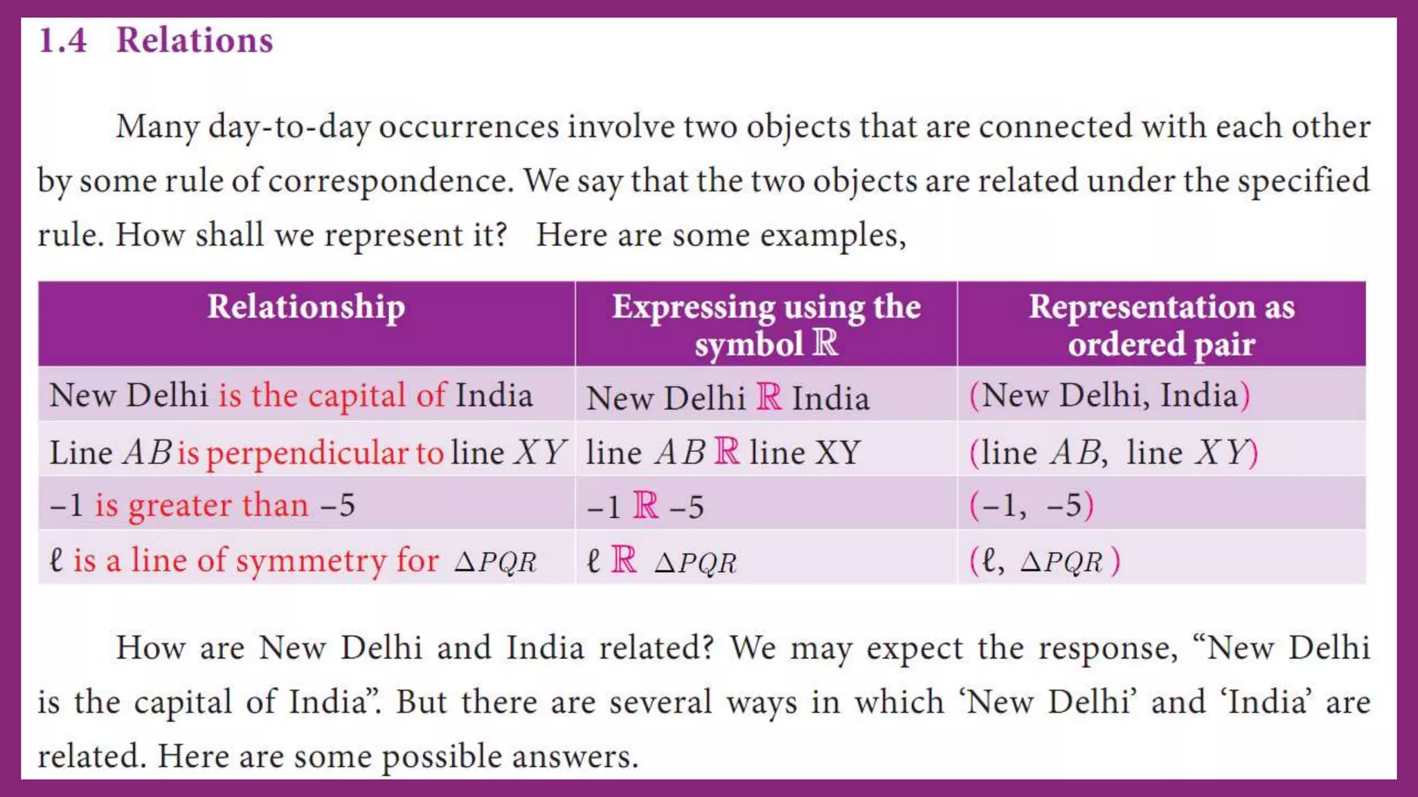 The document is a mathematical pedagogy resource discussing various relations and functions, with examples illustrating the identification of relations based on defined sets. Specific exercises include determining the domain and range of given relations, alongside calculations involving coordinate pairs. It also touches on practical applications within an organizational context, categorizing roles and associated salaries.